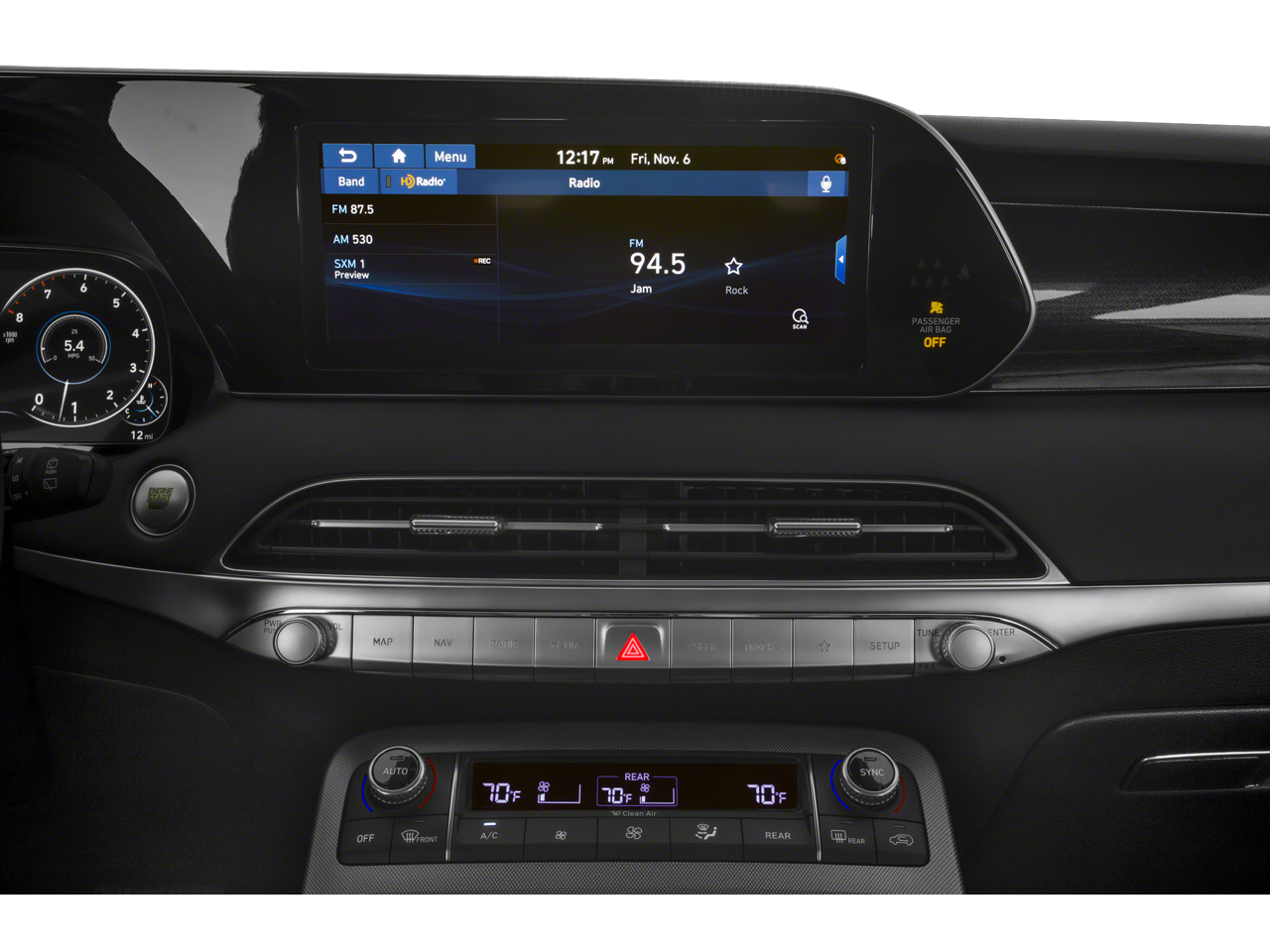 - Radio: AM/FM/MP3 Premium Audio System -inc: 10.25" display screen, Apple CarPlay and Android Auto, Bluetooth hands-free w/wireless audio streaming, steering wheel audio and phone controls, dual front USB ports, SiriusXM, HD Radio, Blue Link connected car system, 12 speakers including subwoofer, external amplifier, Clari-Fi music restoration technology, QuantumLogic surround, navigation system, rear seat quiet mode and driver talk in-car intercom